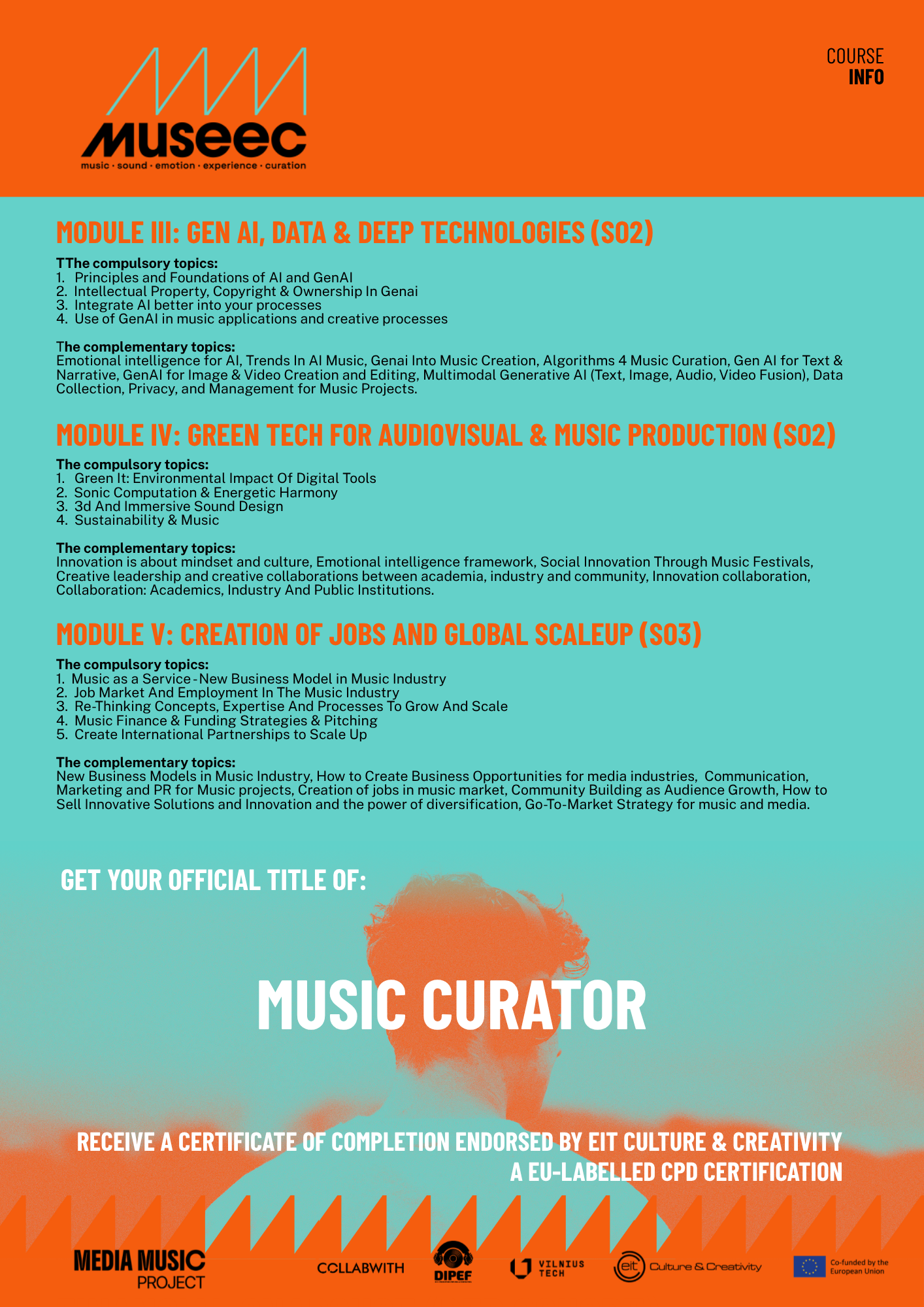 As a pioneering course, MUSEEC brings top-tier expertise to every subject. We are assembling an international faculty of sector leaders—music curators, creative directors, technologists, cultural managers, AI specialists, forward-thinking audio engineers, and sustainability leaders in music—selected for their relevance to the present moment and their ability to lead the field. Coordinators of the course include Jara Pascual (Collabwith) , Christian Len (DIPEF), Kristina Kovalité ( Vilnius Tech),. Additional faculty and guest speakers will be confirmed and announced on a rolling basis, delivering classes, masterclasses, and talks.